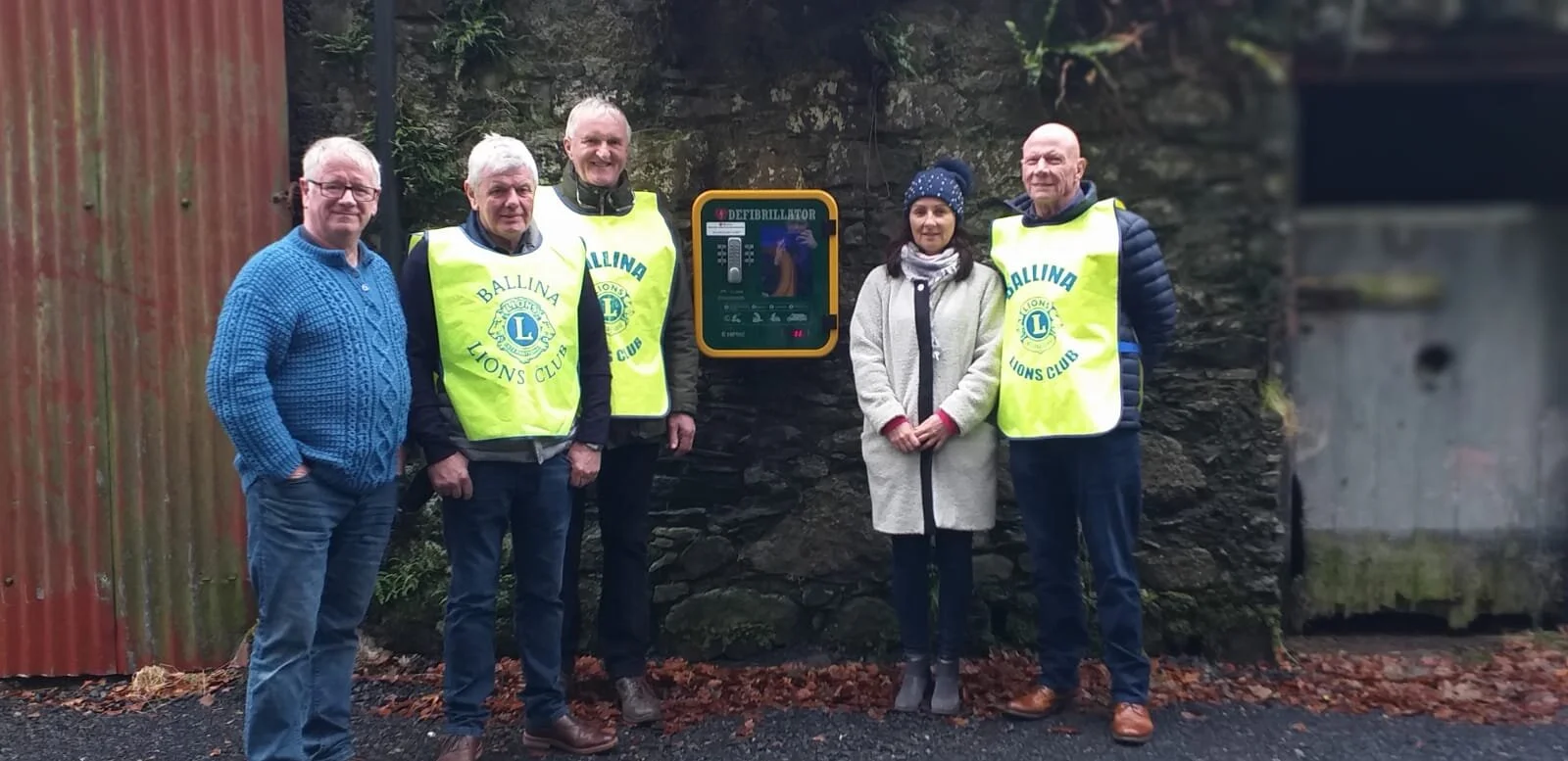 Ballina Lions Club together with Ballina Men’s Shed recently purchased a Defibrillator and an outdoor heated storage box which was recently fitted on a Farm Building wall directly opposite the entrance to Beleek Wood at Knockatenna Car Park, at Knockatinole.